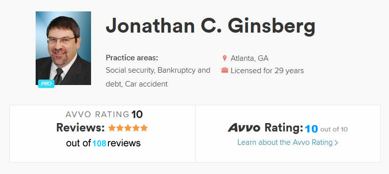 5.0 stars!!! Jonathan Ginsberg is the BEST Lawyer around. He is the best lawyer for bankruptcy and social security cases. He helped me step by step of my case and gave me knowledge about what to expect and what to do with updates! He is wealth of knowledge!!!! Thank you so much you are BEST LAWYER!!!! I WOULD RECOMMEND HIM 110%.