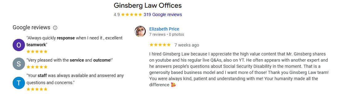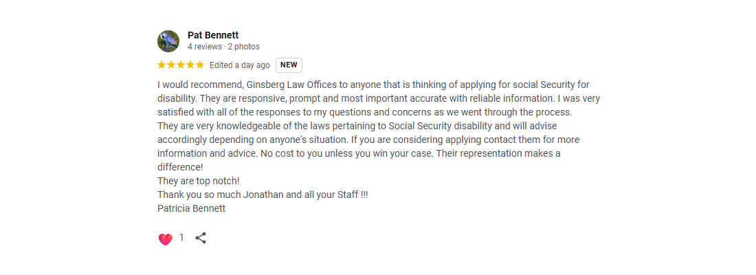 I am pleased with Jonathan C. Ginsberg and his legal team, from day one I was treated with respect and you could tell that there was a genuine concern for my well being, during the waiting process and anytime information was requested. They are happy to answer any questions you have in regards to your case. I was also surprised that my hearing date came sooner than expected. It was definitely a big plus having Mr. Ginsberg as my legal representative for my disability case. I would definitely recommend Jonathan Ginsberg to anyone looking for a thorough but compassionate attorney who is willing to work hard for those whom need professional legal assistance for their disability case.