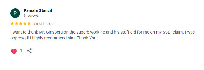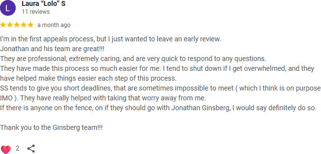 My wife referred me to Attorney Ginsberg as he represented her and won in 2012. On December 16 Ginsberg represented me and I was approved. For those of you who are skeptical regarding reviews relax these are true. Ginsberg is very thorough, precise so that lay people understand and yet has the ability to prepare briefs with honesty, and integrity that meet and exceeds court requirements without leaving one in doubt. We highly recommend Jonathan Ginsberg's law firm to fill your needs.